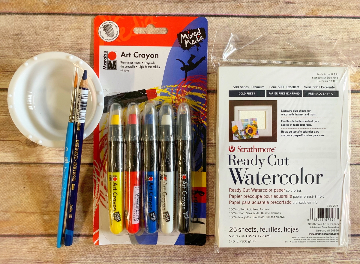 Marabu Art Crayon Primary Set, Strathmore Ready-Cut Watercolor Paper - 5x7, Princeton Artiste Select Brush, Plastic Water Cup, and Derwent Inktense Pencil.